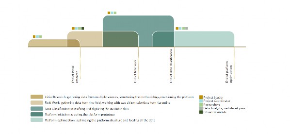 Figure 2. Diagram showing the project's different phases. The methodology of work was spread into 5 phases, starting by the initial research and envisioning the platform as well as situating it within a theoretical framework, then doing an extensive field work to gather the data, classifying it, initiating the platform, and then optimizing it.